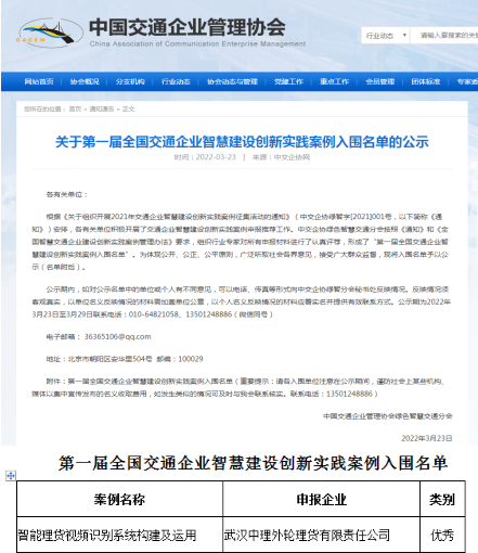 近日,经过中交企协绿色智慧交通分会行业专家的认真评荐,武汉中理智能理货项目成功入围第一届全国交通企业智慧建设创新实践案例。